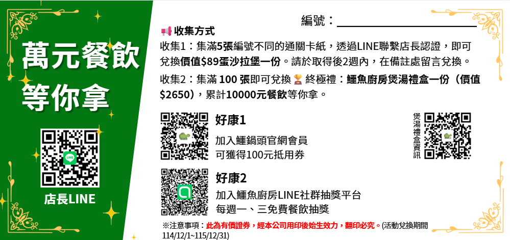 收集2:集滿 100 張即可兌換🏆終極禮:鱷魚廚房煲湯禮盒一份(價值 $2650),累計10000元餐飲等你拿。