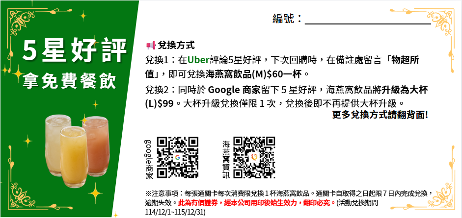 兌換2:同時於 Google 商家留下 5 星好評,海燕窩飲品將升級為大杯(L)$99。大杯升級兌換僅限 1 次,兌換後即不再提供大杯升級。
