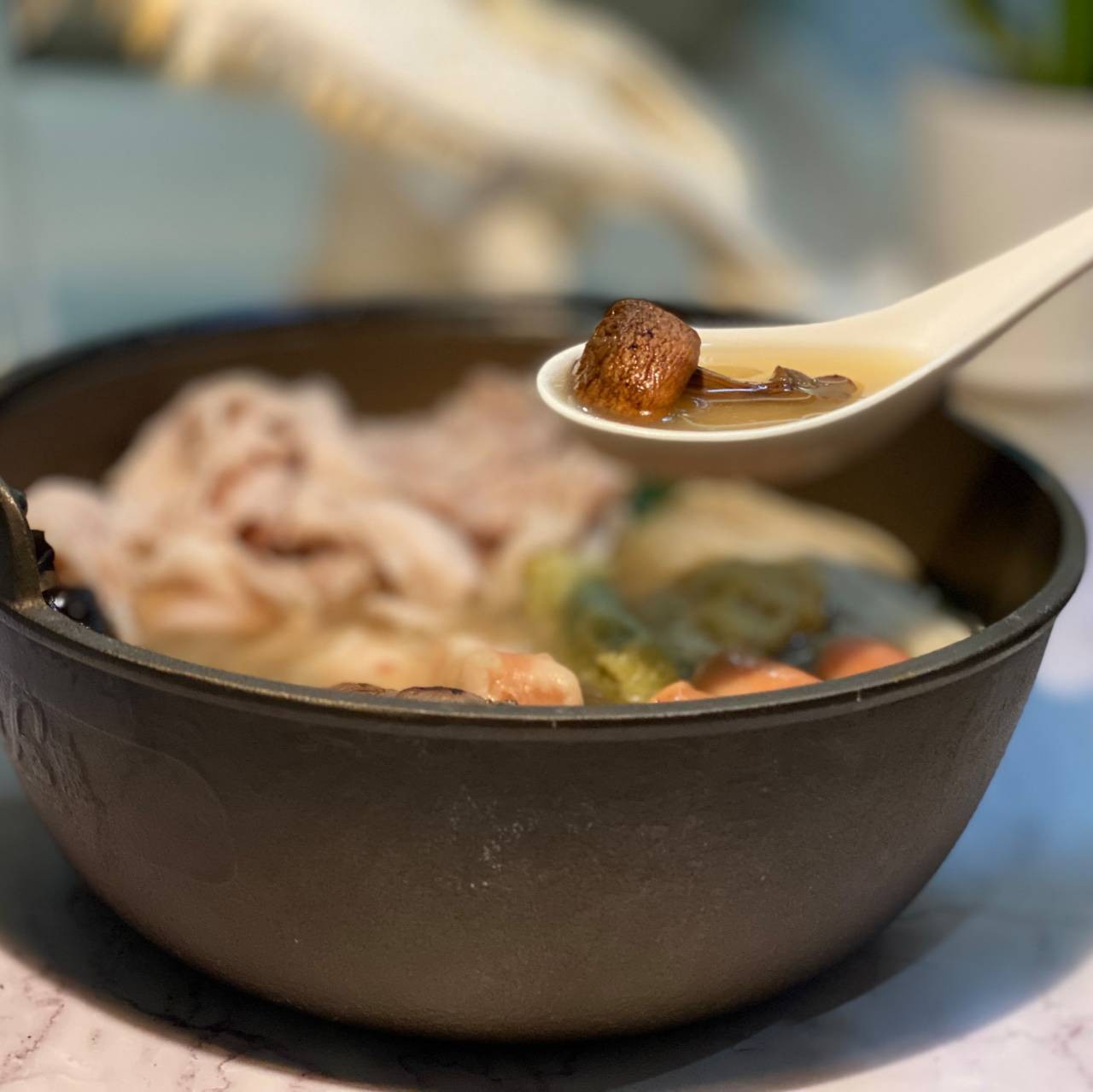 96小時熬煮萃取的鱷魚精華姬松茸湯底,融合日本大花菇與姬松茸精華,富含膠原蛋白和鈣質,強化身體免疫力,重現古代帝王御用食補。搭配日本技術製成的膳食纖維與豐富的蔬食多醣體,整體鍋物呈現濃郁鮮美的風味。